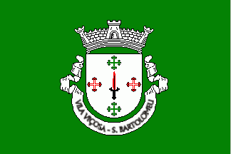 Shield Argent, an knife Gules with hilt Sable set in pale flanked by two crosses fleury Gules voided Argent, in base and central chief a cross fleury Vert. Mural crown Argent with three visible towers (village rank) and white scroll, reading in black upper case letters "VILA VIÇOSA - S. BARTOLOMEU".
