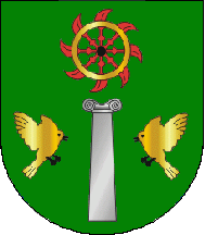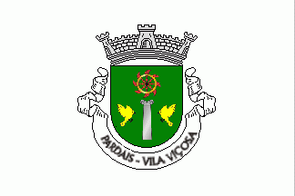 Shield Vert, a Tuscan column Argent flanked by two flying sparrows Or respectant, in central chief a wheel Or with spokes and blades Gules. Mural crown Argent with three visible towers (village rank)and white scroll, reading "PARDAIS - VILA VIÇOSA" in black upper case letters.