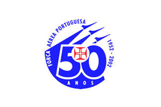 The commemorative logo is inscribed in a circle, with a medium blue contour showing three thrusting fighter planes and the figure 50, plus counterchanged letterings «Força Aérea Portuguesa», «anos» and «1952-2002»; centered overall, on a white disc, the Christ Knight’s cross, which is also the Portuguese Air Force roundel marking.