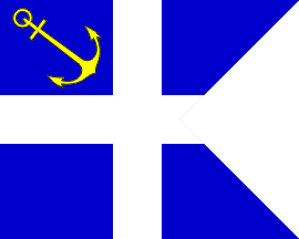 4:5 swallowtailed blue flag with a white cross and a yellow anchor