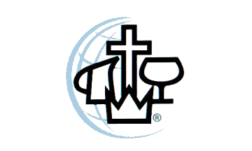 A white flag with the CMA logo on it: on a partial blue globe, a cross, crown and communion jug and goblet.