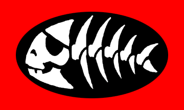The other emblem is a cartoon-style fish skeleton wearing a pirate eye band.