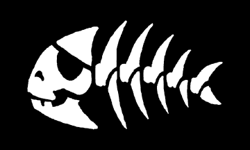 design of the pirate fish flag: a plain white fish on black background, in