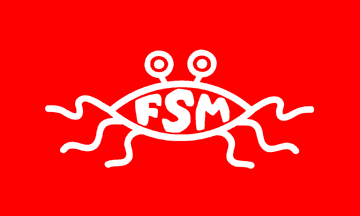 Pastafarians use mainly two emblems, both inspired in the Christian fish, as seen on http://www.venganza.org/images/churchbanner.jpg. One emblem has the same "rugby ball" shape of the stylized fish with added eye stalks and tentacles, usually with the initials "FSM" (Flying Spaghetti Monster) on it. Apparently not used in flags, but not unlikely. Other uses seem to abound: see http://www.venganza.org/fish.htm.