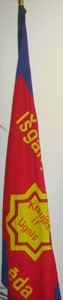 Here is another photograph of the flag, with tassels, depicting an indoor