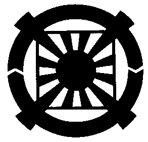 Chapter 10There is a black & white illustration of the symbol on the webpage - 12 rays emanating from a central disk are inscribed within a square whose corners touch the inner edge of a thick circle; 8 of the rays are completely within the square but the four diagonal rays extend beyond both the square and the thick circle. In this illustration there are 2 chevrons or v-shaped breaks in the circle, but I have seen other illustrations without them.