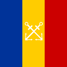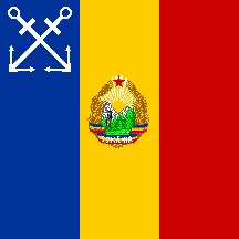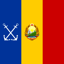 Art. 6. The naval jack is the specific mark of military ships which shows their rank and it is represented by a square bunting cloth having the colors of the flag and the coat of arms of the Socialist Republic of Romania printed on both sides. On the blue stripe are applied two crossed white anchors, having the same size as the coat of arms.Alex Danes 3 October 2008