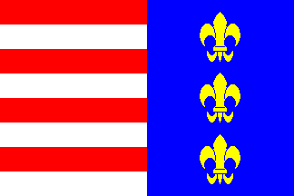 Vertical diband: the hoist half eight red and white horizontal stripes; the fly half blue with three yellow fleurs-de-lis stacked on top of each other.