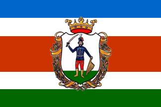 The flag [photo, photo] charged in the middle with the municipal coat of arms, is designed horizontally, divided in six equal stripes, blue-white-red-red- white and green.