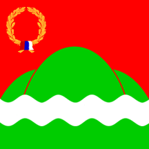 The municipal flag of the municipality of Savski Venac shall be square-shaped, coloured red, in base a golden field, above it a white fess wavy shifted to base, above the fess a green mount of tree coupeaux, and in upper canton, next to the hoist, a golden oak wreath joined by the Serbian tricolour flag.Surprisingly, the Decision mentions a "golden base" wich does not appear on the municipal banner of arms.