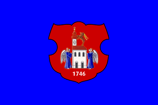The flag is blue with the municipal coat of arms centered. The flag proportions are probably 2:3, to match the national flag of Serbia.