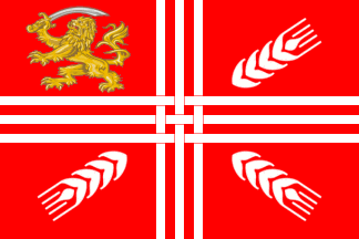 The flag is a banner of the municipal arms. The cross which appears in the flag and arms is a "cross triple parted and fretted" (Wikipedia).