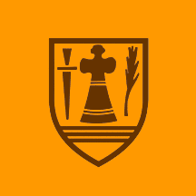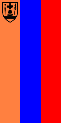The flag is made for vertical hanging, vertically divided orange-blue-red, with the municipal emblem occupying the top part of the orange stripe.