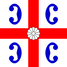 The flag of Surdulica, doptes on 9 July 2003, is a square white flag with a red cross ensigned with a white twelve-petailed rose and four blue firesteels.
