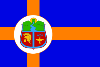 The town of Zaječar adopted new symbols, arms and flag after a public contest. The flag is in proportions 2:3, blue with a decentered orange cross on blue, charged with the town's emblem.