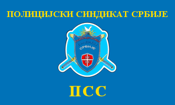 The flag of Policijski Sindikat Srbije [Police Union of Serbia] flag is dark blue with the union emblem, surmounted by ПОЛИЦИЈСКИ СИНДИКАТ СРБИЈЕ, and with ПСС under the emblem, all writings in gold letters.