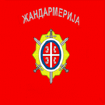The flag of the Zandarmerija, as drawn after photographies of the real flag, is red with the Zandarmerija insignia, surmounted by Zandarmerija written in Cyrillic silver letters (ЖАНДАРМЕРИЈА).
