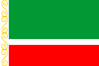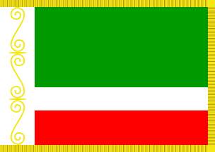 Along a staff on the white vertical strip is yellow Chechen national ornament.