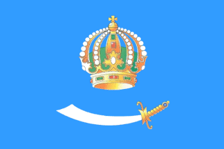 Clause 3. The flag of the Astrakhan Region represents a rectangular panel of light-blue colour, in the middle of flag the gold crown consisting of a hoop with three visible leaf-formed and gold mitra, fastened by five visible arches decorated with pearls, with green lining. Mitra coroned by a gold orb with a cross. Under the crown an eastern sword silver with gold hilt turned to the right. Dimensional width of the image of crown and sword (…) should make 1/4 parts of length of a panel of a flag. The relation of width of flag to its length — 2:3.
