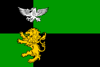 green cloth with a yellow "rampant" lion and a white "displayed" eagle