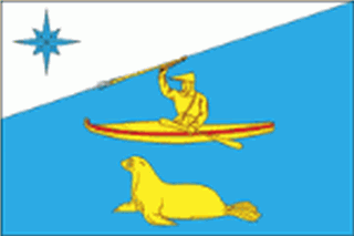 The flag described as: blue in the ratio 2:3 with the white ascending triangular wedge at the upper edge and figures from the emblem in colors of yellow, red, white and blue. Symbolism: The colors and figures mirror the national, ethnographic and economic peculiarities of the Aleutian homeland. The hunter in native clothing seats in the kayak and holds a local hunting gun, sort of harpoon with three additional arrows. This image stresses the hardship conditions of making a living in the Far East. There is also an image of the sea lion, symbol of the local fauna and wealth. On the white edge, there is a blue compass rose (Rose of the Winds) - symbol of discoverers, travelers and mariners. Commander Islands are often called :"The Land of Winds and Storms".