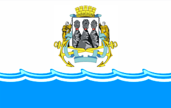 Flag of city of Petropavlovsk-Kamchatsky in Kamchatka Territory is adopted in 18-oct-2006. Flag is divided by wavy line (symbolizing seaport) in two fields: upper - white and bottom - light blue. Height ratio of fields is 2:1. Ratio of the flag is 2:3. White filed is charged with city's coat of arms. Shield is Argent with three active volcano peaks.