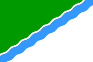 The flag is divided diagonally from upper right to lower left corner by blue belt with white waves. Left upper field is green. Lower right field is white. Colors of flag were taken from city arms and mean: green field — health, nature wealth (resources) of Siberia, white field — purity and snow of Siberia, blue belt with white waves — river Ob’, on which the city is situated.Pascal Gross, 15 Jan 1999