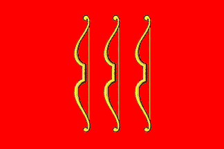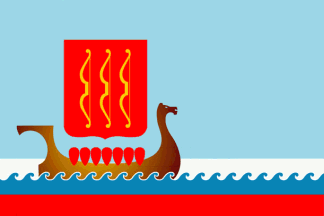 This flag is based on historical coat of arms of this city, created in 1724 by first Russian heraldist comte Francisco de Santi from Piemonte. It is wrong, so-called “speaking arms”. The name of city Velikie Luki occurs from three big bends of the river Lovat’.These bends in Russian refer to “luka” (plural — luki), i.e. Velikie Luki = Great Bends.