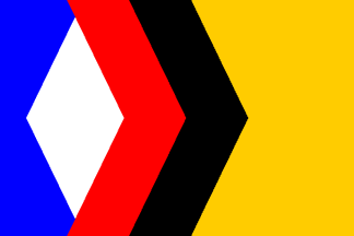3.1. The flag of Engels-city municipality represents a rectangular panel consisting of a blue field at staff and a yellow field at fly border of a flag, which are blocked by two shevrons — red and black, which tops are inverted to middle of fly border of a flag. The top red shevron coincides with the centre of a panel of a flag, the top black shevron will defend on 2/3 lengths of a flag from staff. On a blue field is represented to red shevron a white vertical rhombus of height in 3/4 width of a flag. The attitude of width of a flag to his length is 2:3.