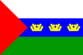 Flag of Tyumen Region is a rectangular field consisted of three equal horizontal stripes; upper - white, medium - blue, lower - green; with a red »…« triangle in the left side (from the hoist) of the field. There are three crowns »…Law of 1996.03.26: