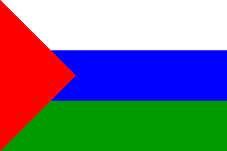 …» Makes alterations to “Law of Tyumen Region on Arms and Flag” (adopted by regional Duma 11.5.1995). The first paragraph of Article 9 of the Law now must be: «Flag of Tyumen Region is a rectangular field consisted of three equal horizontal stripes; upper - white, medium - blue, lower - green; with a red »« triangle near the hoist.»The other two paragraphs of the article 9 (about antlers crowns and about ratio) were not changed.