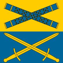 Yellow over blue square flag with two crossed marchal's staff in the yellow field and two crossed yellow swords in the blue.