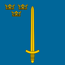 Blue square flag with a upright yellow sword and three yellow crowns (2-1) in canton.