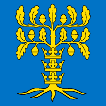 I blått fält en ek med tre kronor uppträdda på stammen, allt av guld.