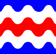 Blazoned in English: "Four times parted per fess wavy, Azure, Argent, Gules,