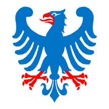 Argent, an Eagle displayed Azure beaked, langued and membered Gules.