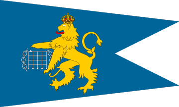 Blue swallow-tailed broad pennant with yellow lion rampant, crowned proper and holding white portcullis with chains.