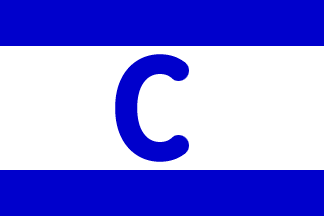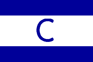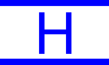 white with 4 narrow horizontal stripes; in the center a blue shield charged