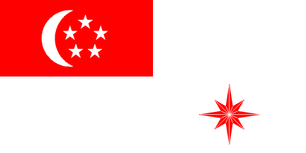 The Singapore war ensign is white with a red canton with a white crescent and stars, crescent pointing to fly, and an eight-pointed red cardinal points device in the fly. Ratio 1:2. Source: Barraclough and Crampton 1981 [bcr81].