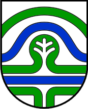 The former coat of arms of Cerknica is white, outlined in black, with a symbolic representation of a landscape with a stylized tree. This emblem consists of a horizontal blue line, under which are two green angled lines (rising from bottom and when reaching the blue line turning left and right and exiting horizontally out). Above the blue line is another green one with an "island" in the middle with cut out part forming the silhouette of a tree. Above this one is another blue line which is arched around the tree silhouette.