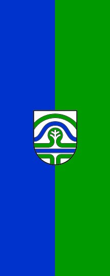 The flag, in proportions 2:5, is horizontally divided blue-green with the municipal coat of arms in the middle. A vertical version of the flag is prescribed, in ratio 5:2, vertically divided blue-green with the coat of arms rotated and set in the middle of the flag.