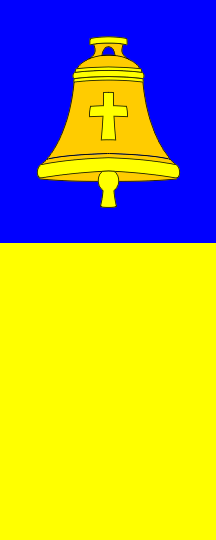 shield width. It can be blazoned as "Per pale, vert a wheat stalk or with 24 grains and two leaves, azure a church bell or with a Catholic cross" (as it