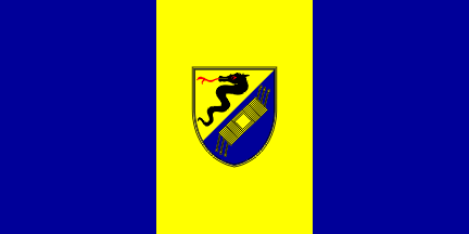The flag is vertically divided blue-yellow-blue, with the municipal coat of arms in the middle stripe.