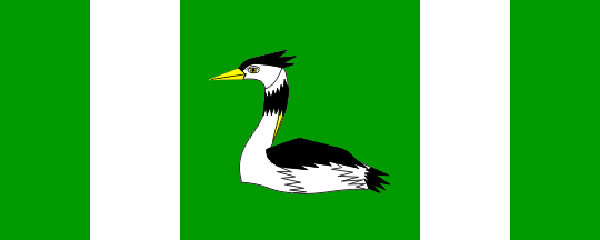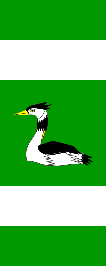 The flag is rectangular, in proportions 2:5, green with two vertical white stripes forming a square field in the middle and two green fields on the edge of the flag, with proportions 3:3:8:3:3. In the middle there is the grebe from the coat of arms.