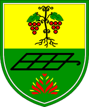 [The coat of arms is] in shield shape, in upper part showing a vine branch with green leaves and red grapes on yellow field. In lower part is a black grill below which are red and yellow flames all on a green field.