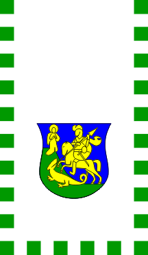 The flag is rectangular, in proportions 2:1 (vertical), white, bordered with green and white squares along the three edges, with the municipal coat of arms placed in the lower part of the flag. There is no horizontal flag prescribed.