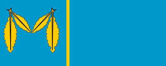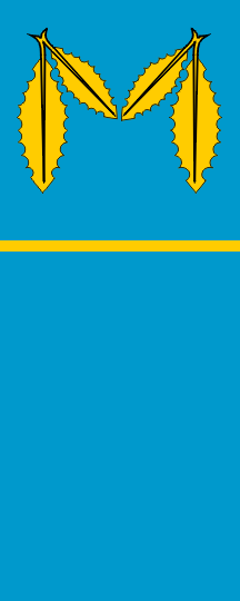 General: The flag of the municipality of Majšperk is blue with four yellow leaves of sweet chestnut in the first square of the flag field, divided from the rest of the field by a yellow vertical stripe.Description: The flag field is rectangular, with ratio of the height to the width 1:2.5. The field is divided into two equal in height and different in length parts. On the first blue square part of the flag field is set the first attribute from the municipal coats of arms: golden leaves of sweet chestnut, from upper left and right corner of that field symmetrically to the vertical axis of the field issuing two differently sized leaves on each side: outer, larger hanging vertically downwards, and inner smaller meeting each other in the crossing point of the diagonals of the field. The attribute should not be smaller than 2/3 of the height of the field, and not higher than 8/10 of the same size.The first field of the flag is divided from the rest of the flag by a yellow vertical stripe, that should not be thinner then 1/50 of the flag length, nor wider than the 1/25 of the same size.