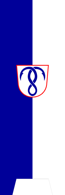 The flag of Mengeš is vertically hoisted, vertically divided blue-white with the municipal coat of arms slightly off-set to the top and with tails at the bottom (that is with an unusual trapezoidal indentation).