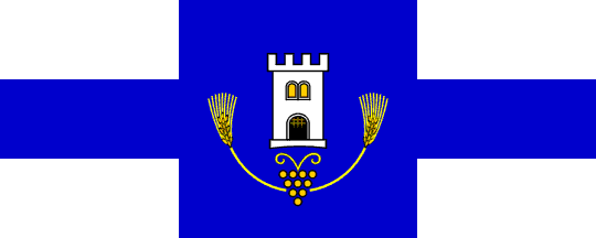 Based on the coat of arms were prepared several designs of flag. The international association of the vexillologic societies [FIAV] has very strict rules and hierarchy of flags. [First time I hear that. This just can't be true!] The state flag, the flag of municipality, city and finally that of the local council must be different and there are special rules for each group. [while first part is true, I am not aware of any FIAV rules regarding the division level]. For the municipal flag, for example, it is said that it should not include the image of the coat of arms, while that it not so for the national flag [???]. Similarly, it should not use more than two colours [???]. For the flag of Ormož, the selected colours are white and blue. Since the attributes - the charges from the coat of arms, the tower, the sun and the moon - are in the blue field, while the ears and grape are in the green one, the experts came to a problem. Namely, the third, green colour on the flag is not allowed. Therefore they decided to break some vexillologic standards for the first time in the new Slovene vexillology, and to combine the attributes from two fields of different colours into one field. The golden ears with the grape are taken from the green field and set into blue, of course, only on the flag.The coat of arms and the flag of the municipality were designed after an expert study and many thoughts by the Heraldica Slovenica society members. Even on pictorial level they are very nice. Valt Jurečič told us that in year 1996 there was adopted the law on heraldic, vexillologic and sigillographic register of Slovenia, to be lead by the State Archive of Slovenia. When the Minister for Culture appoints the commission to collect the coats of arms and the flags into the register, to evaluate and approve them, it shall happen that not all of them shall be confirmed. There exists quite a number of such, some prepared by the municipalities themselves without the experts. Such coats of arms shall need to be expertly redesigned or heraldically expertly improved, so that they shall be inscribed into the register. We are missing the roof law that would determine the rules of the game, but these are already known in Central Europe, and we shall have to follow them.