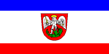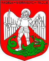 The coat of arms of Radlje ob Dravi is based on a XVIIth century seal, picturing on a red field silver Archangel Michael standing with wings displayed holding in his dexter a flamy sword and in his sinister scales and with his sinister leg over a dead dragon vert. Along the chief is inscribed "RADELAH MERINBERCH RADLJE", the first being (I believe) the oldest variation of the town name, the second is the German version and the last the modern Slovene name.